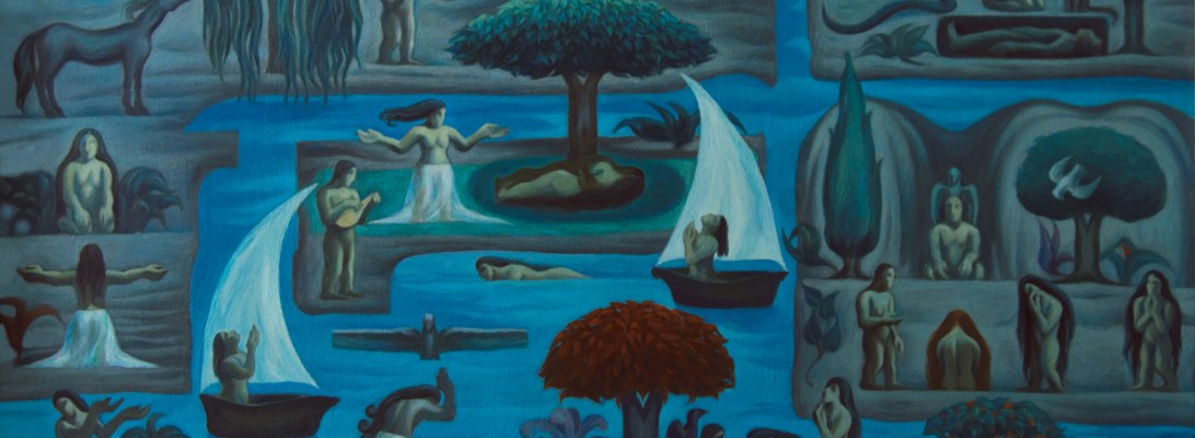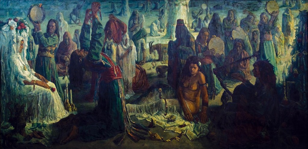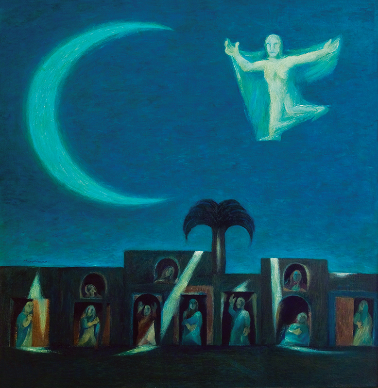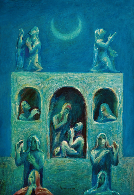 في لوحة “أساطير حول الهرم” نشاهد ملحمة درامية تضج بالأحداث، رغم الثوب السكوني الذي يغلفها، فها هو الهرم بتكوينه البديع وشكله الجميل الراسخ يحتل المنطقة الذهبية في اللوحة، بينما اصطف أسفله عدد من الرجال والنساء وقد انخرط كل منهم في حالة ما، فهذا يرفع يديه بالدعاء، وذاك ينتحب في حين هام في فضاء اللوحة حول الهرم أمراتان أتخذتا أوضاعاً مسرحية، كذلك وقفت اثنتان من النساء في حالة جزع عن يمين وشمال الهرم الذي أحدث به الفنان تجويفاً ملأه رجل ذو نكهة “مومياوية”.