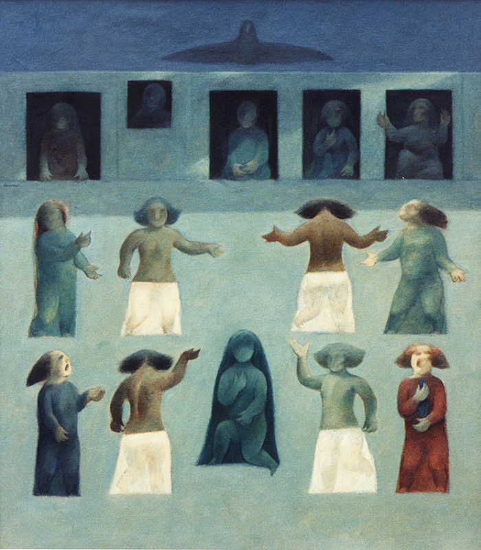 لا يلتزم صبري منصور كثيراً بالحلول الأكاديمية المملة عند معالجة شخوصه وعناصره، فالنساء مثلاً تخففن من سطوة التشريح المنضبط للجسد، فلا ملامح واضحة، مع نزعة لتضخيم الأيدي، مما يفاقم من انهمار الدراما علي سطح اللوحة، خاصة وان هناك امرأتين خرجتا من الكادر العام، واستقرت كل واحدة بجوار نخلتها.