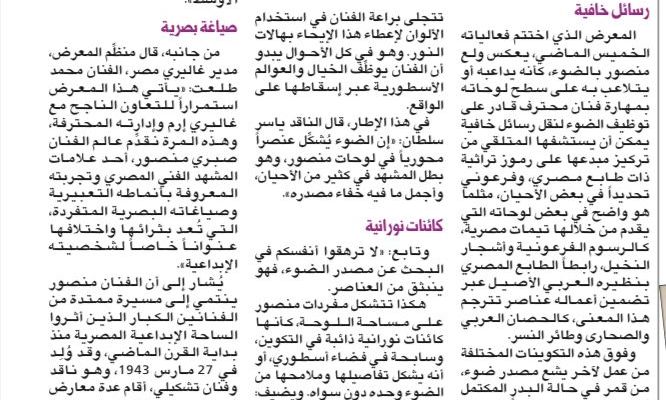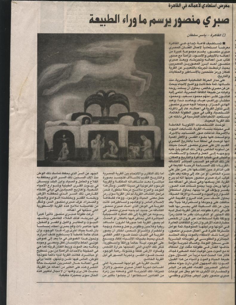 للأسف قليل من الفنانين التشكيلين من حظي بنعمة الثقافة وذاق لذة المعرفة ، والأقل من تشغله الأسئلة ويظل يلهث طوال حياته من أجل اصطياد الإجابات الصحيحة، والفنان الكبير صبري منصور من اولئك القلائل الذين أنهكهم البحث عن الخصائص الجمالية الت تميز الفن المصري، فقرأ وتعمق، وأبحر في فضاءات المعرفة الفسيحة، وقدم لنا نتيجة بحثه الدءوب متمثلاً في حصاد عامر من اللوحات المتفردة.